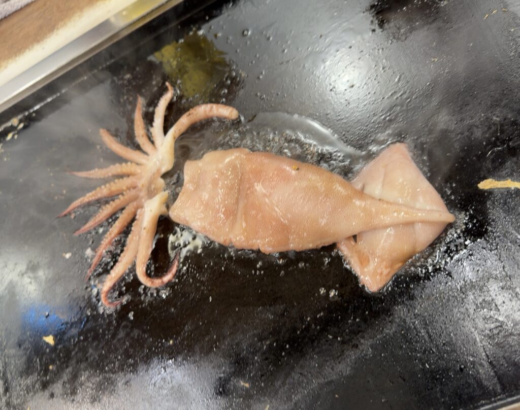丸ごと一杯のイカが、鉄板でじゅわっと焼かれる。