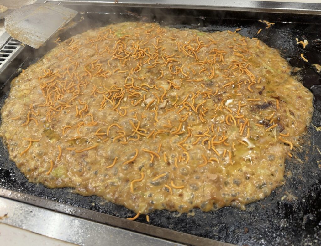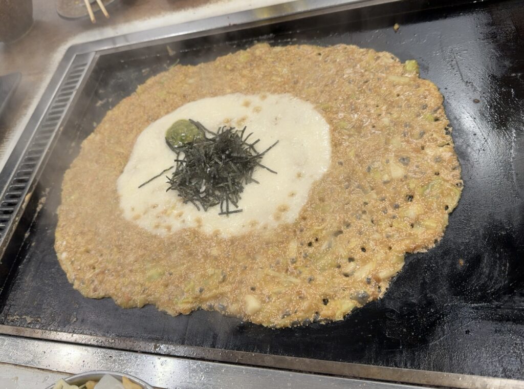 鉄板の上で焼き上がる「かのや」の明太もちチーズもんじゃ。山もいもと青のりがトッピング