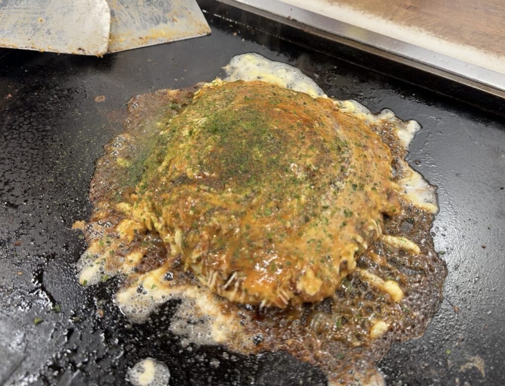 鉄板の上で、店員さんが手早く返して、ソースをジャッとかける。