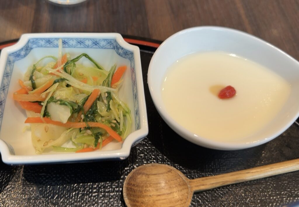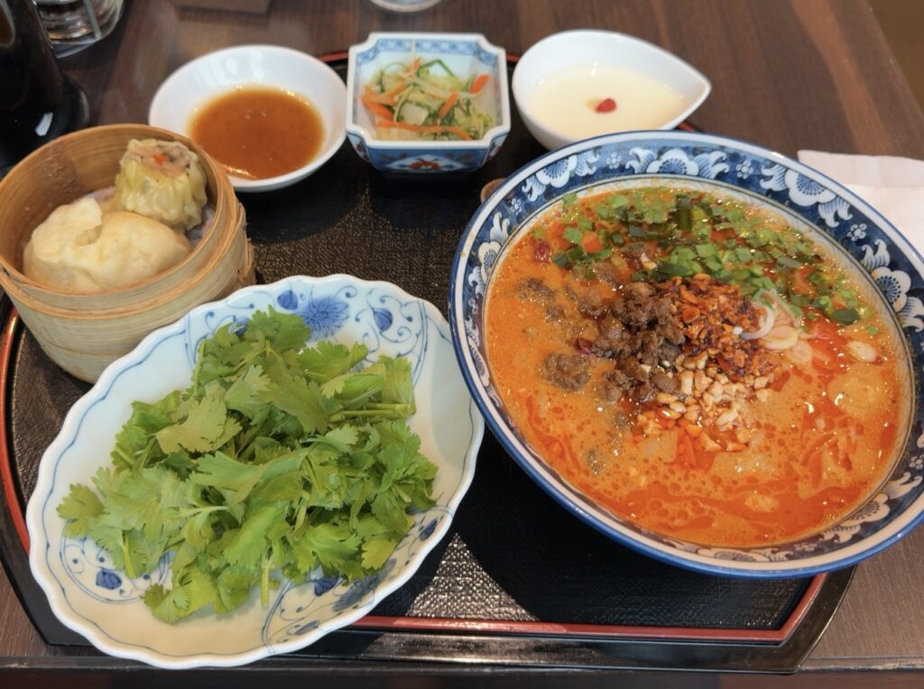 北千住「梅梅(メイメイ)」の担々麺と点心膳セット。担々麺、蒸し豚まん、焼売、パクチー、小鉢、杏仁豆腐の贅沢な昼セット