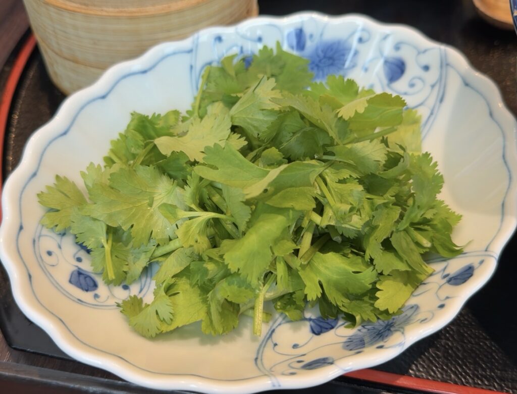 A. 担々麺と点心膳セットには、別添えで山盛りのパクチーが付いてきます。途中から投入して味変するのがおすすめ。苦手な方は注文時に伝えれば外せます。