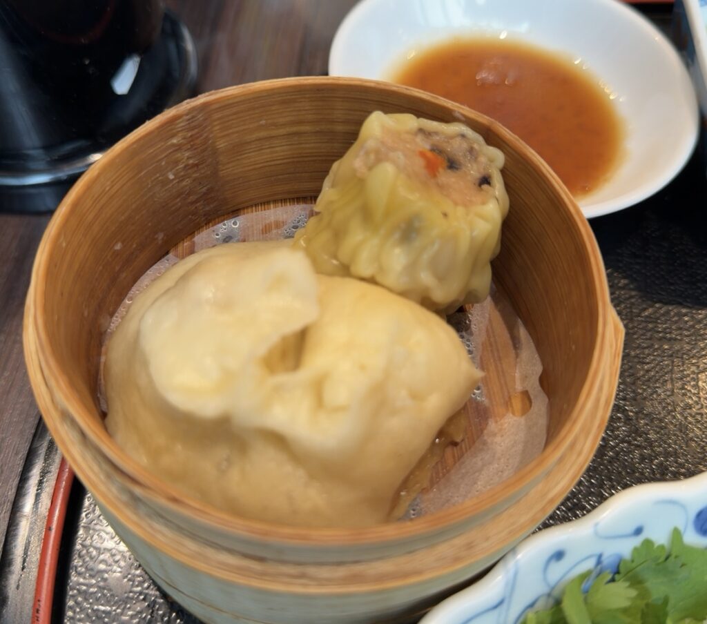 竹のせいろを開けると、ぷっくり膨らんだ蒸し豚まんと、肉汁を抱えた焼売が並んでいる。