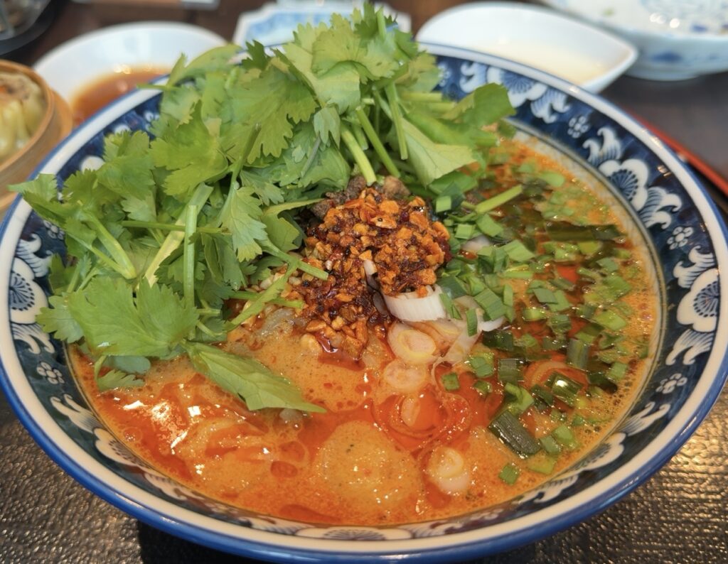 赤い担々スープ、せいろの湯気、山盛りパクチー、そして杏仁豆腐。